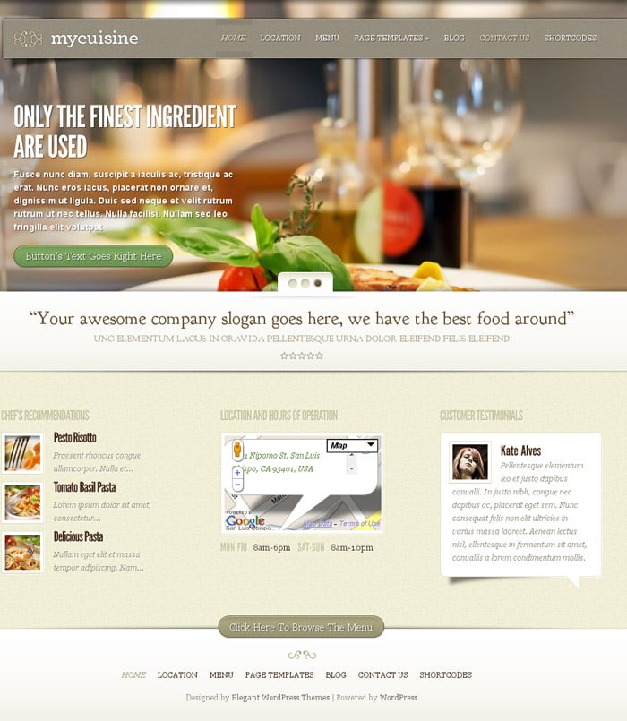 Are you a restaurant owner in need of a stylish way to display your fabulous dishes and decor online? Using the power of WordPress and our versatile customizable restaurant theme we can have your site online quickly! And, with the ability for you to manage all your content from any computer with internet access!